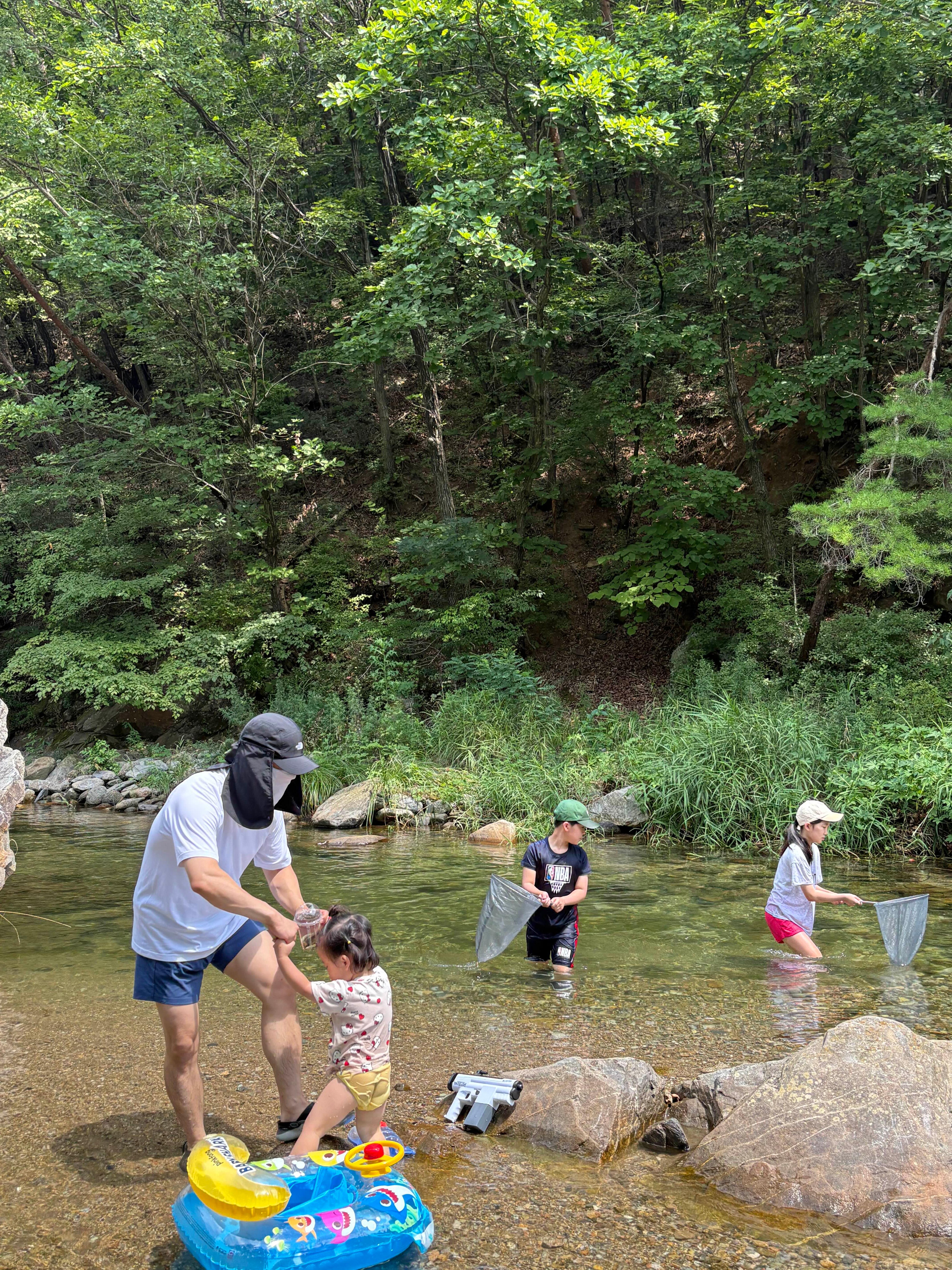원래는 고수동굴을 보고 나와서 다리안계곡으로 가려고 했는데, 조카들이 여기 계곡에 물고기가 있는 것을 보고 흥분해가지고, 뜰채를 갖고와서 잡기 시작했어요. 저와 엄마도 다슬기를 줍줍해봅니다.