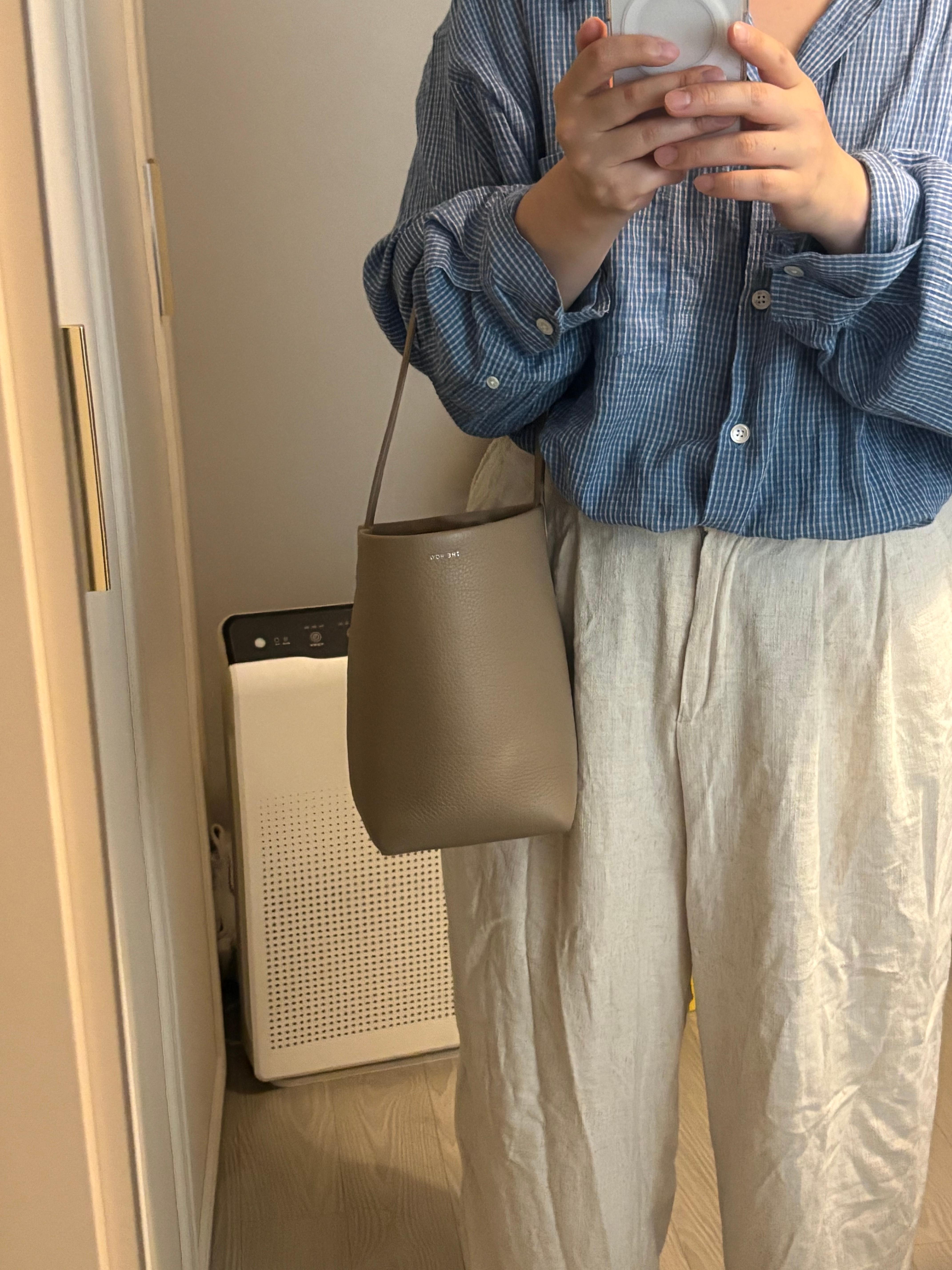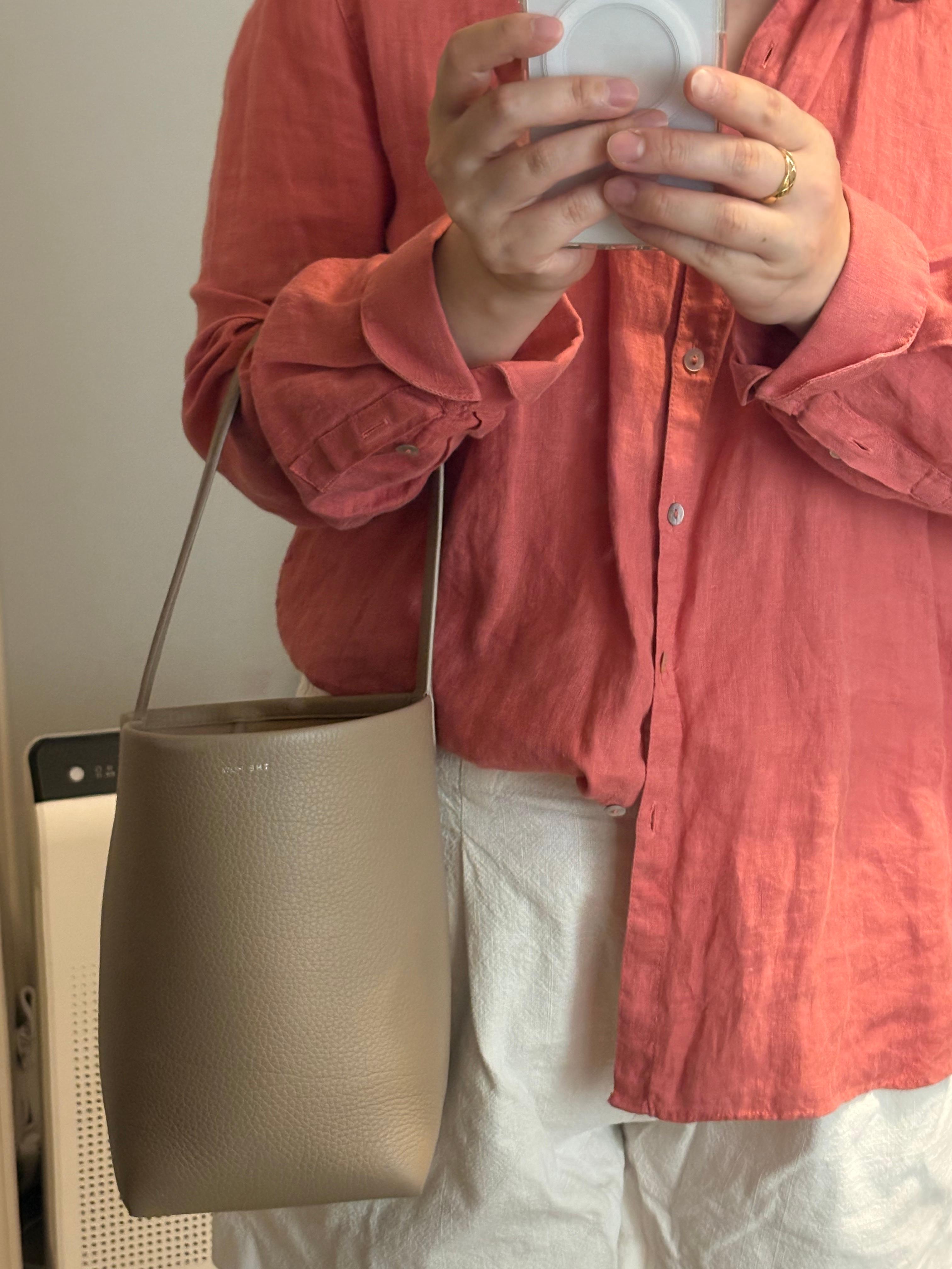 66-77을 입는 저에게는 박한별언니 처럼 가방이 넉넉한 느낌은 없지만(그언니도 스몰 사이즈 산건데 커보이는 매직ㅎㅎ), 처음의 시큰둥한 반응에도 불구하고 정말 정말 잘들고 있습니다. 티셔츠에도 잘 어울리지만, 특히나 셔츠에 너무 예쁜것 같아요.