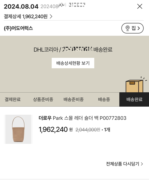 아무튼 24년 8월에 저의 생일을 맞아 나에게 주는 선물로 더로우 파크백 스몰을 구입했습니다. 저는 SSG에서 구입을 했고, MYTHERESA에서 배송을 받았습니다. SSG 해외직구의 형태였는데, SSG에서 중계를 하는 것인지 모르겠지만, SSG 직구니까 정품이겠거니 하고 의심없이 샀어요 ㅎㅎ 주문하고 10일이 안되서 받았던 것 같네요. 지금은 이 해외직구도 가격이 10% 이상은 올랐던데, 명품은 지금 사는게 가장 싼 것 같습니다. 처음에 봤을 때 '와 예쁘다' 이런 느낌은 없이 약간 시큰둥하게 언박싱을 했었어요. 심지어 사진도 노란쇼파에 있는 저 사진 달랑 한장이네요. 에르메스 에블린은 박스 열면서 너무 예뻐서 소리지르고 사진 백장씩 찍고 난리였는데 ㅎㅎ 더로우 파크백은 '음 깔끔하네' 라고 반응을 했었죠.