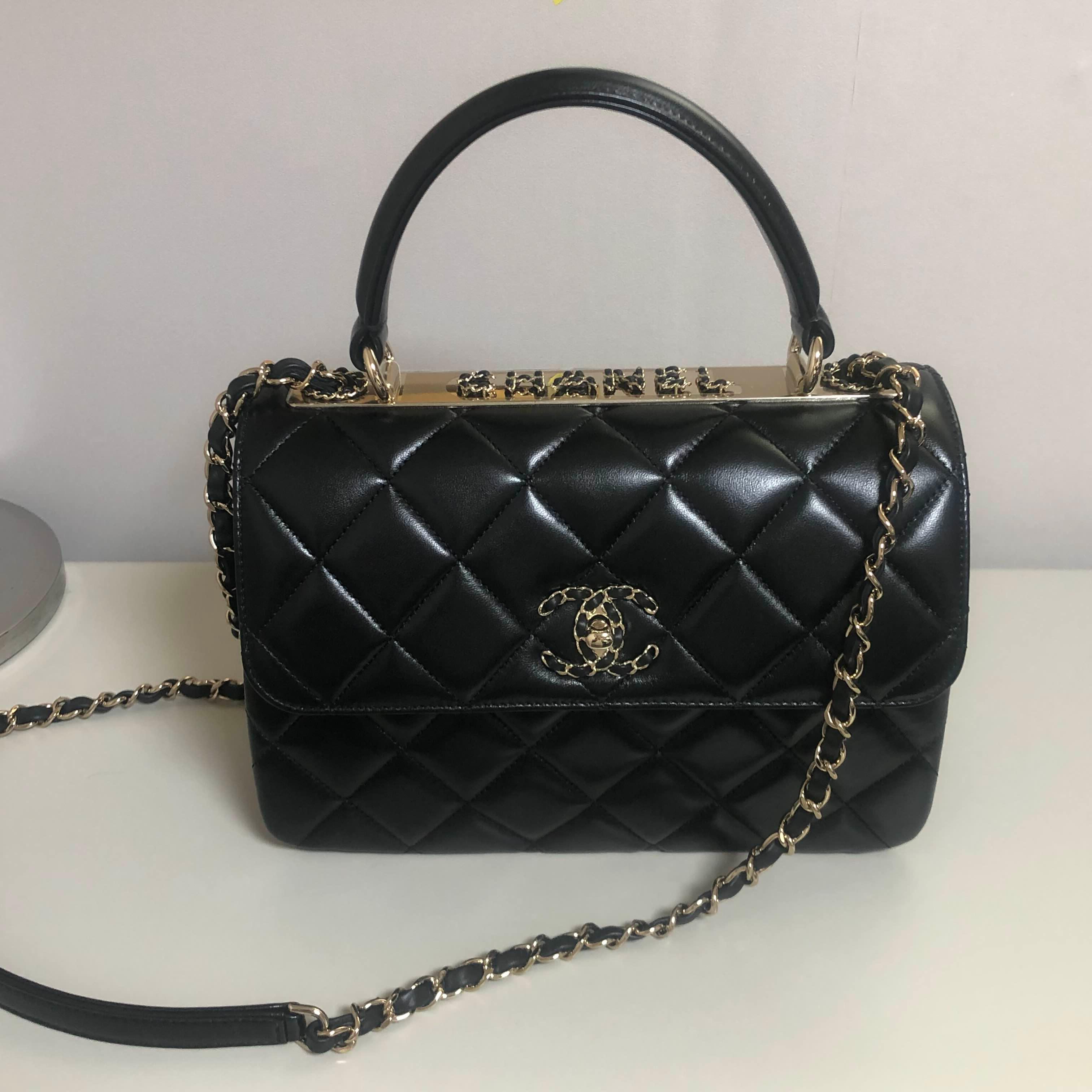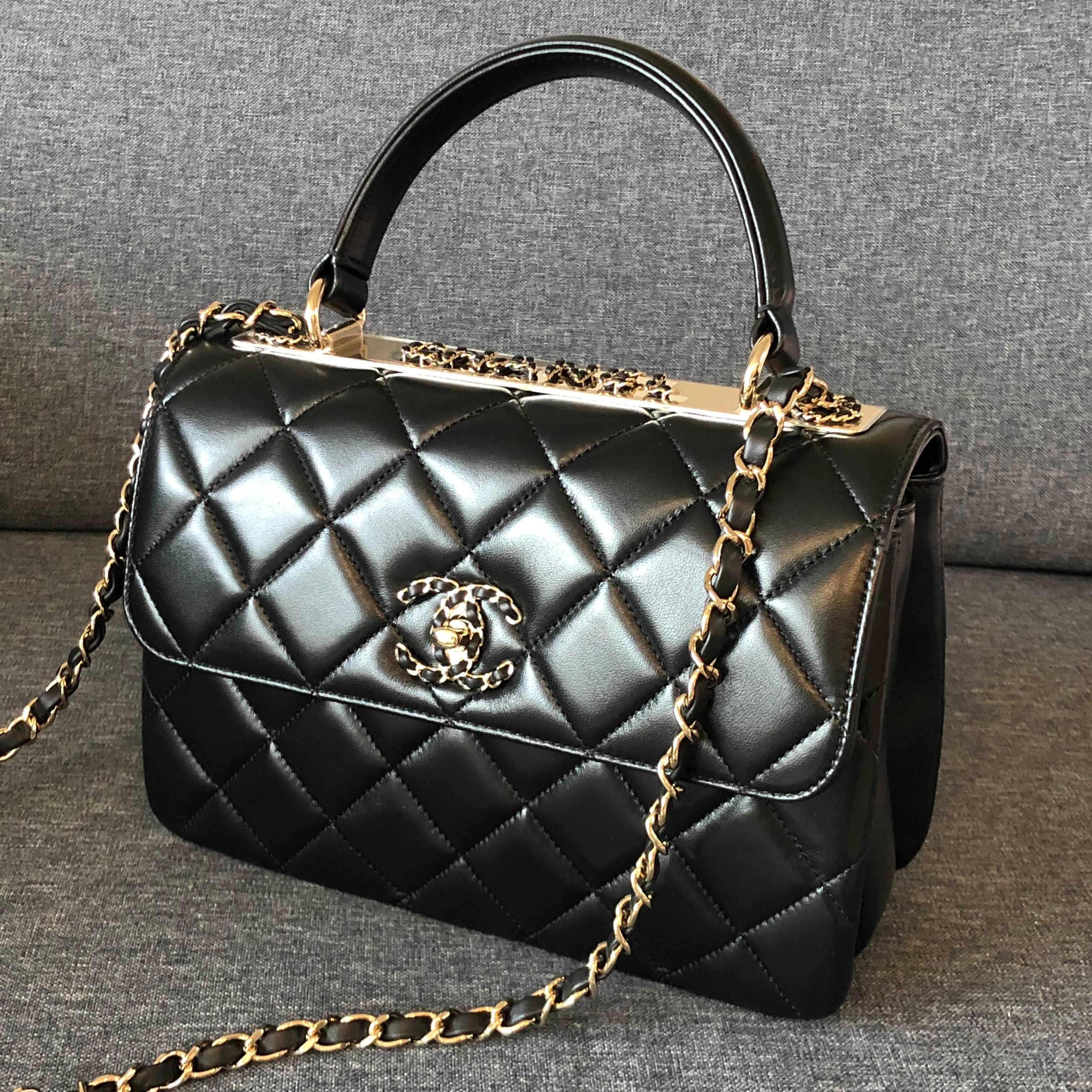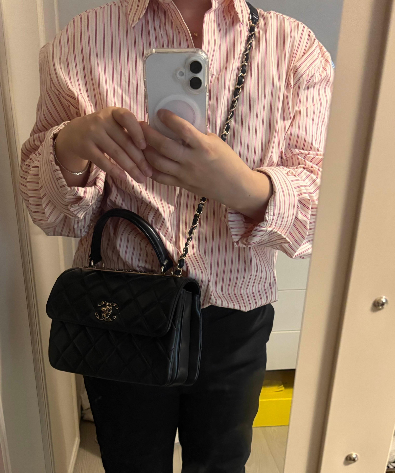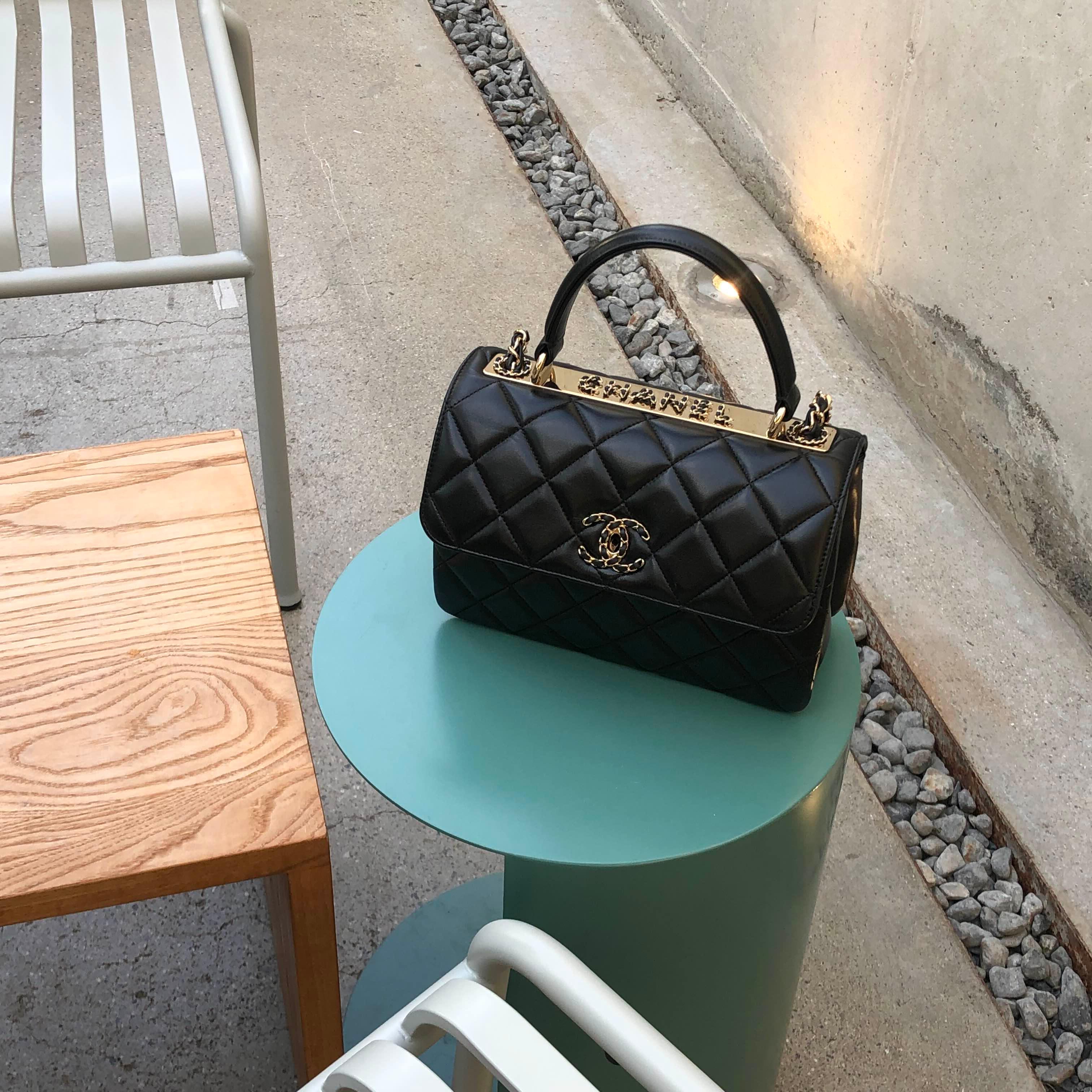 저 가방을 처음봤을 때, 저는 일단 탑핸들 디자인이 싫었고, 가방 위쪽에 금속 판이 덧대진 점도 싫었고, 샤넬 로고도 징그러운 이상한 혼종 가방이라고 생각했었는데, 메보니까, 나열한 단점이 안보이게 참 예뻤어요. 로고가 19백 스러운 것은 저 트씨가 시즌 한정으로 나온 디자인이라서 그런데, 그래서 가격도 일반 트씨보다 백만원이 넘게 비쌌답니다 ㅠㅠ(그 당시 트씨 스몰 가격이 940만원대).