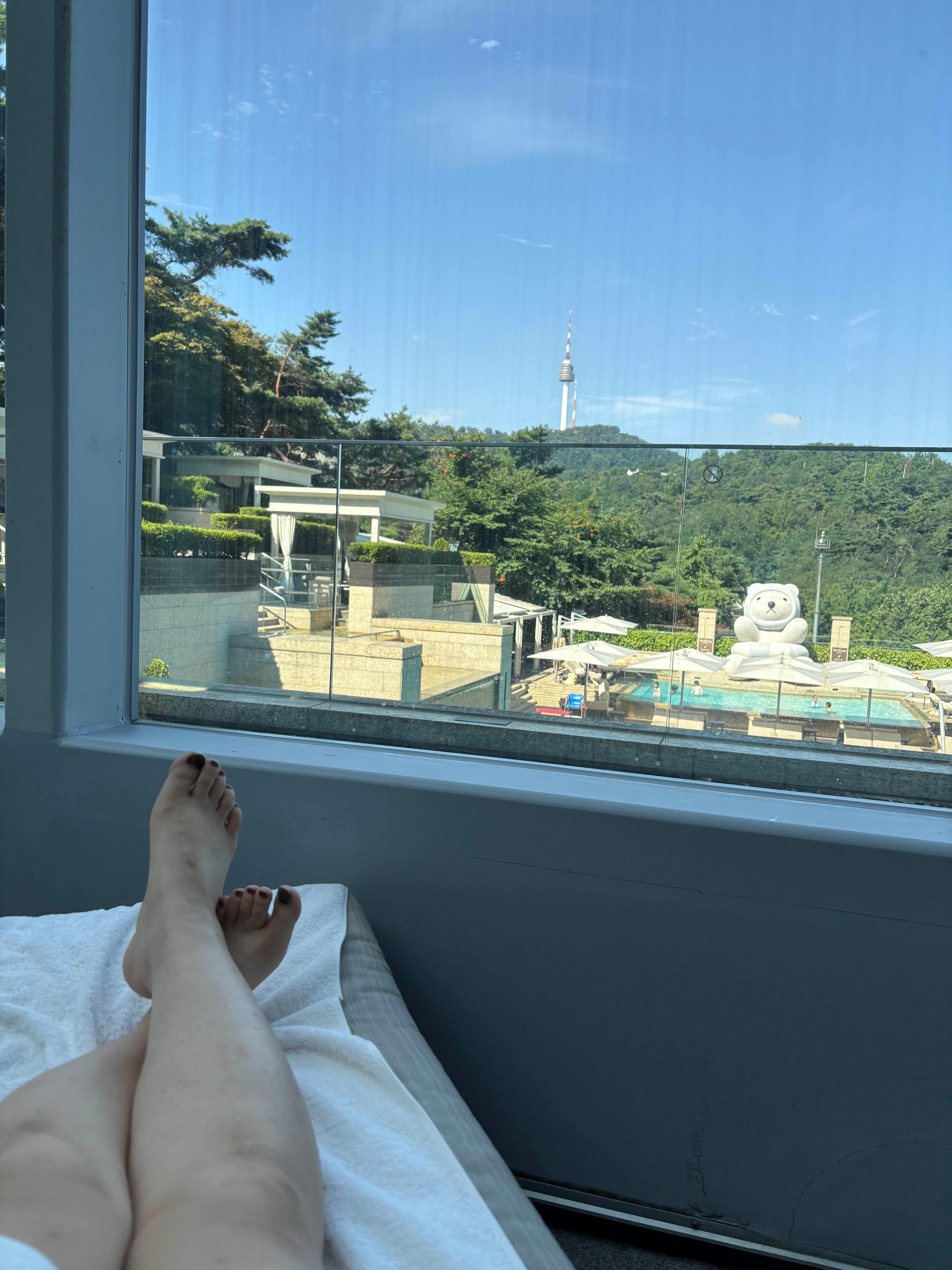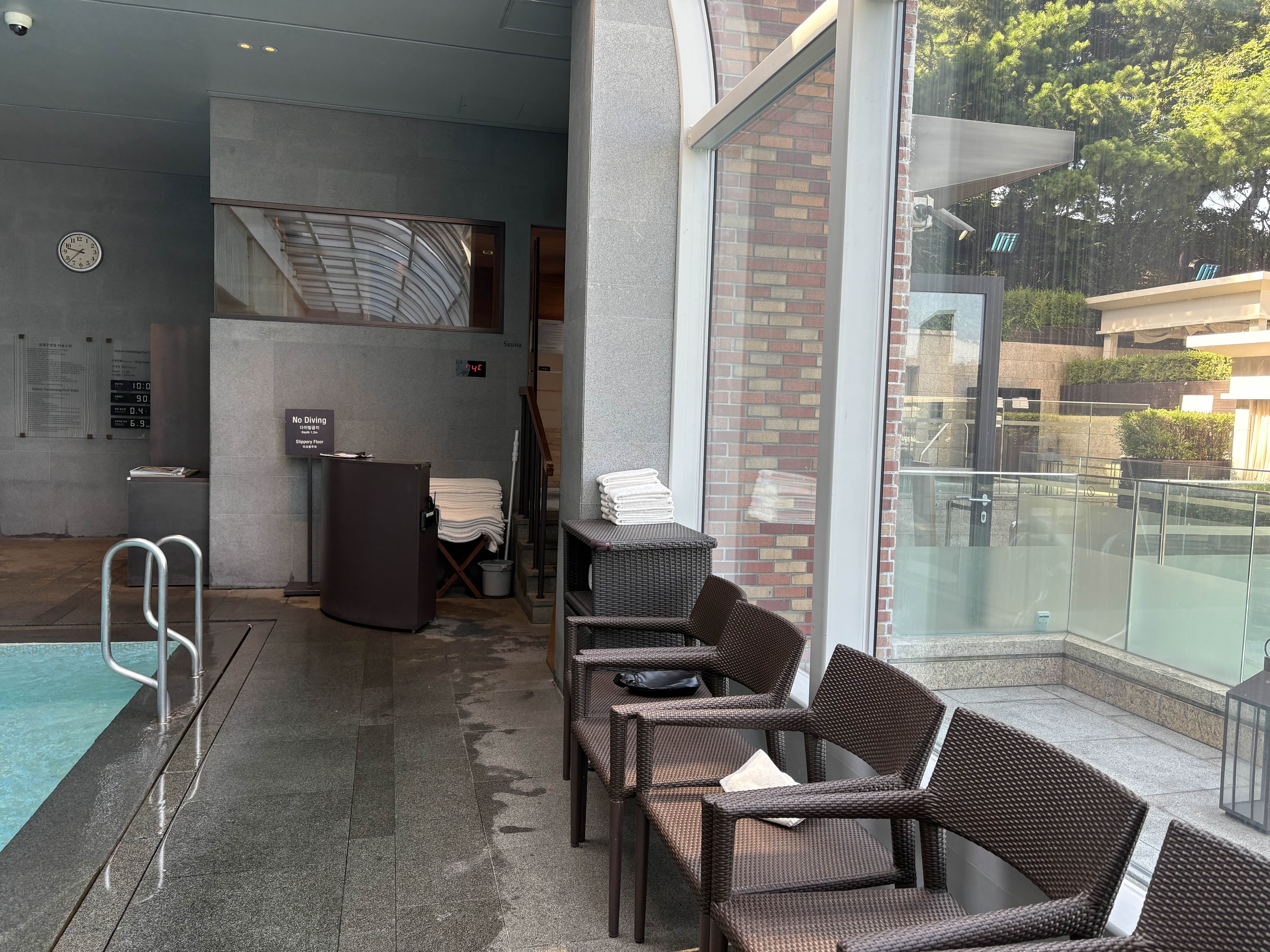 수영장이 무료라고 해도, 막상 귀찮아서 잘 안가게되는 것 같아요. 안가게 되는 원인중에 하나가 '수영모' 인데요, 다행히 수영모를 무료로 대여해주시더라구요. 그래서 수영복만 챙겨가도 이용할 수 있습니다! 수영장은 작지만, 통창으로 남산과 어반아일랜드, 숲이 어우러지는 뷰라서 그냥 가만히 있어도 참 좋더라구요. 레일이 세개 있었는데, 두개는 회원전용 레일이고, 하나를 투숙객이 이용할 수 있어요. 투숙객 레일에는 걷는 사람도 있고, 각양 각색이더라구요. 저는 개헤엄을 쳤습니다.ㅎㅎ