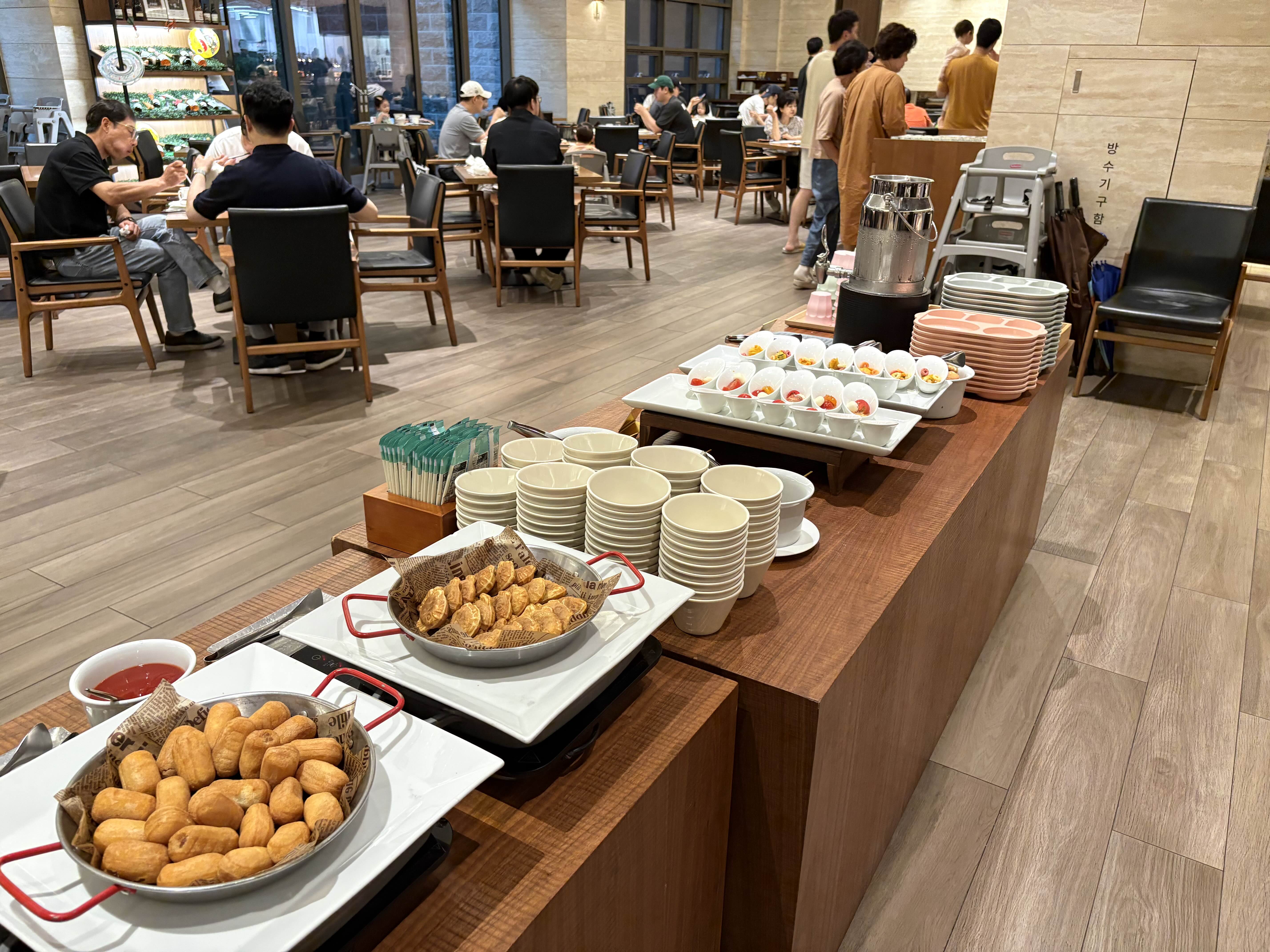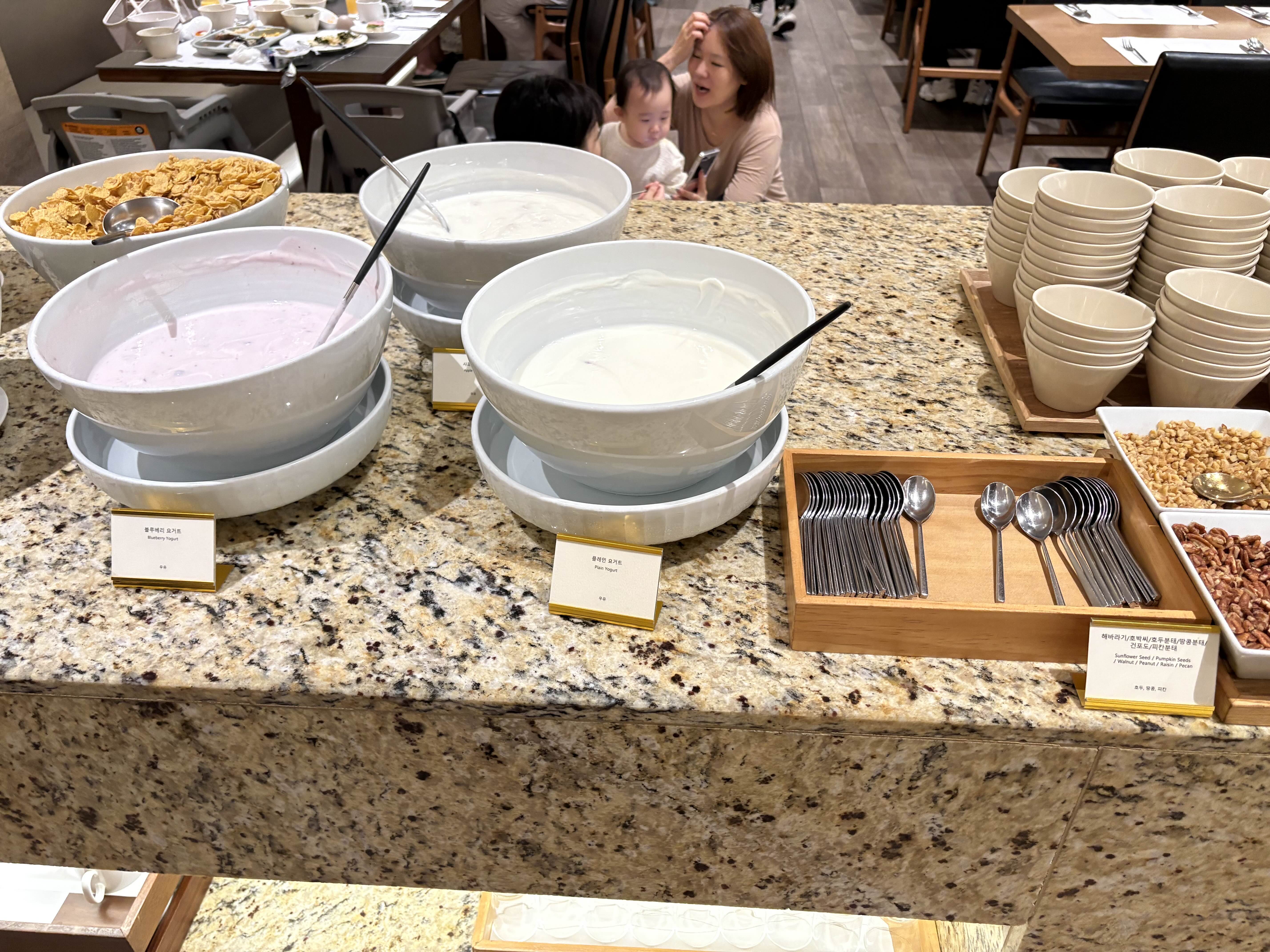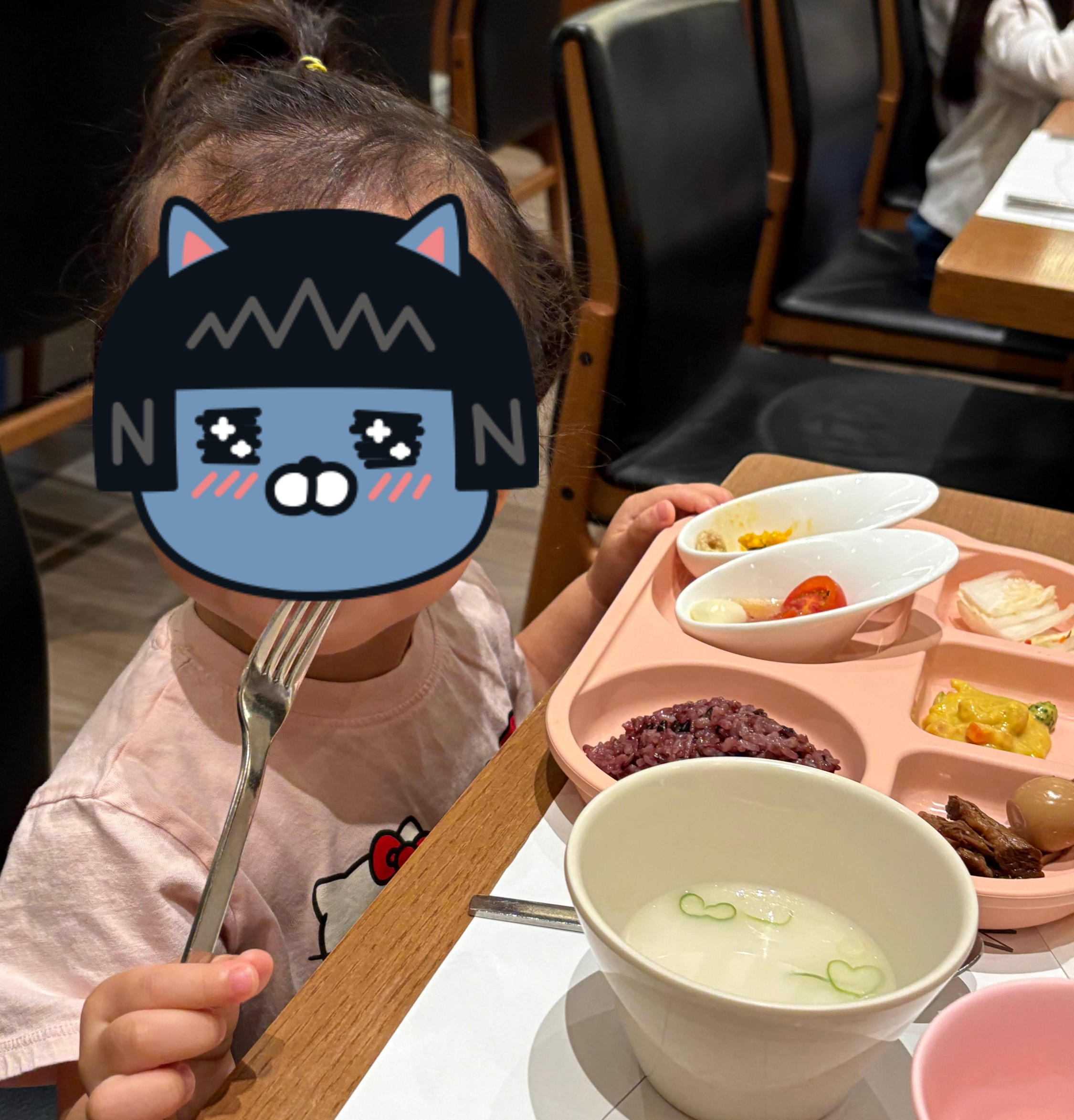 만족스러웠던 포인트 두번 째는, 바로 이 키즈코너에요! 아이들이 먹기 좋게 저염식으로 다양한 구성의 요리들로 따로 코너를 해놨더라구요. 멸균 우유도 있었어요! 아기 식판에 각종 반찬들과 곰탕을 담아와서 냠냠 먹는 우리 딸! 식당 뿐 아니라 숙소 전반적으로 아이들을 배려하는 분위기라서 참 좋았습니다.