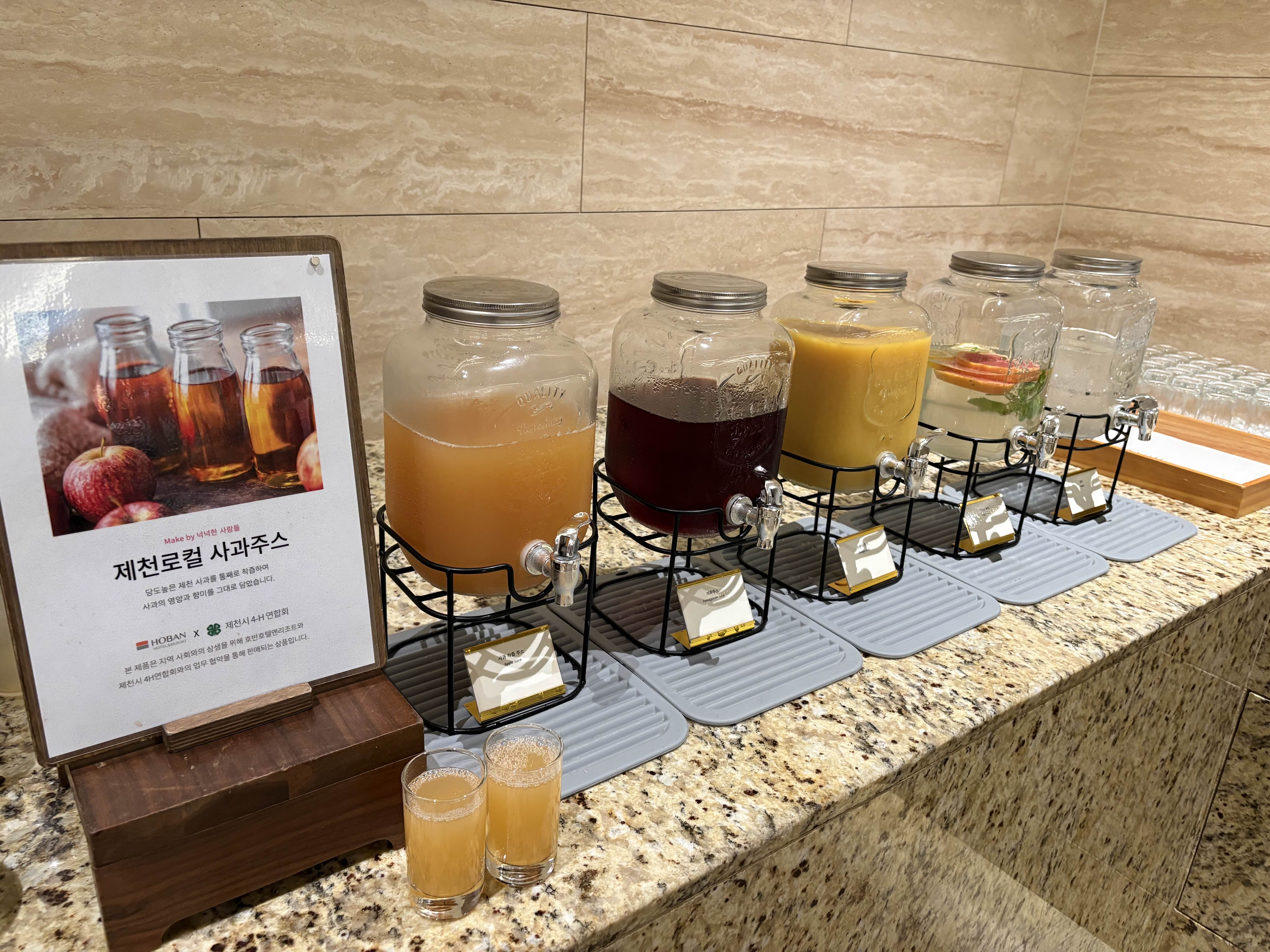 과일은 저 사진에 수박이 추가로 있었고, 사과처럼 예쁘게 컷팅이 되어있었어요. 몬도키친의 조식뷔페에서 만족스러웠던 부분중에 하나가, 오른쪽 사진의 사과주스에요. 제천에서 제배되는 사과를 착즙해서 만든 주스인데, 너무 달콤하고 맛있어서 몇번을 가져다 먹었는지 모르겠어요~