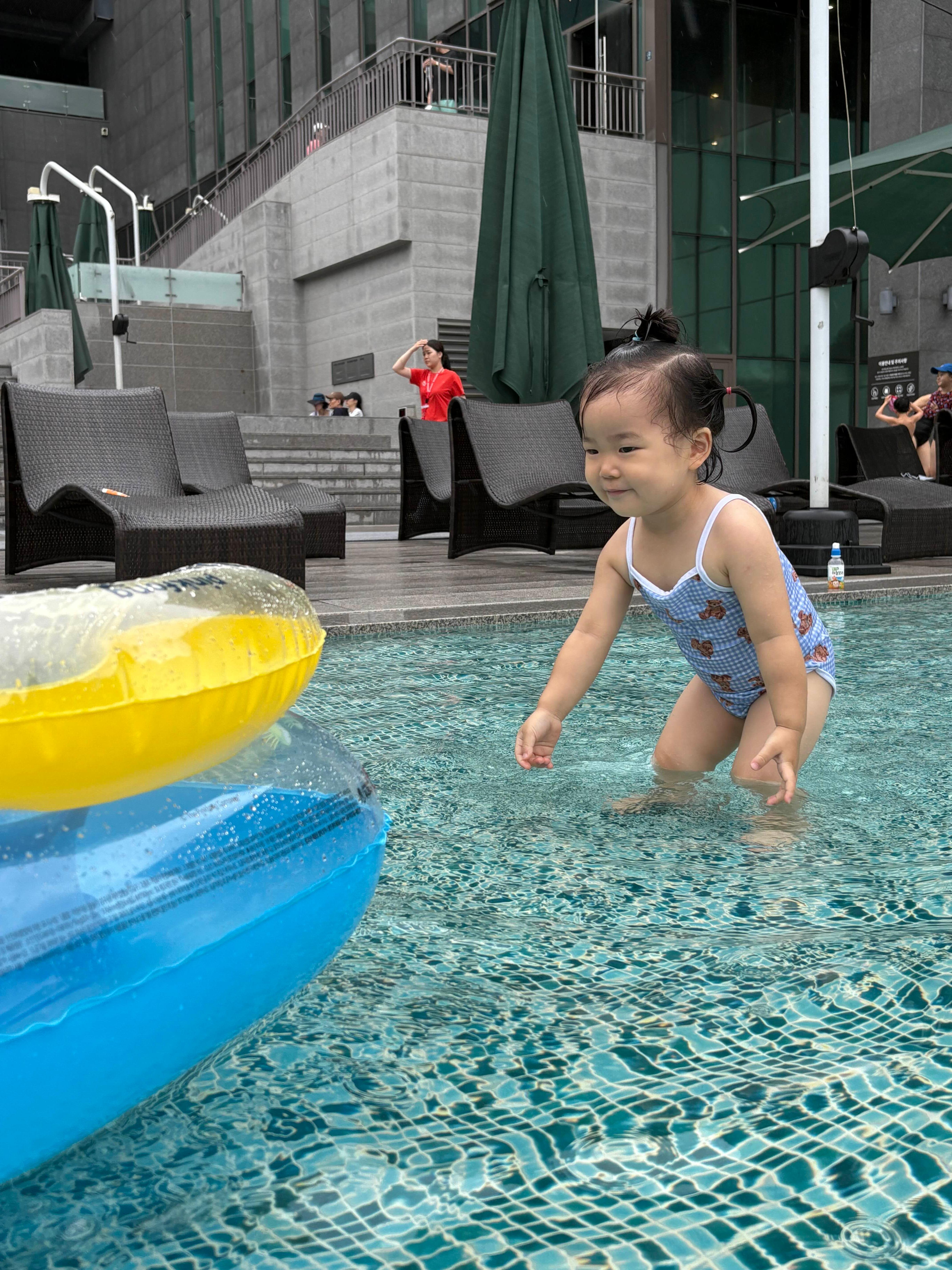 여기가 인피니티 스파존입니다ㅎㅎ처음에 들어가면 아이들이 놀 수 있도록 얕은 수심으로 되어있고, 좀 더 걸어가면 120cm정도의 수심의 수영장이에요. 온통 숲으로 둘러 쌓여있고, 물도 온수라서 노곤노곤하고 기분이 참 좋더라구요. 저희 아가는 물을 약간 무서워하는 편인데도, 주변에 애기들이 많아서 그런지 잘 놀았어요!