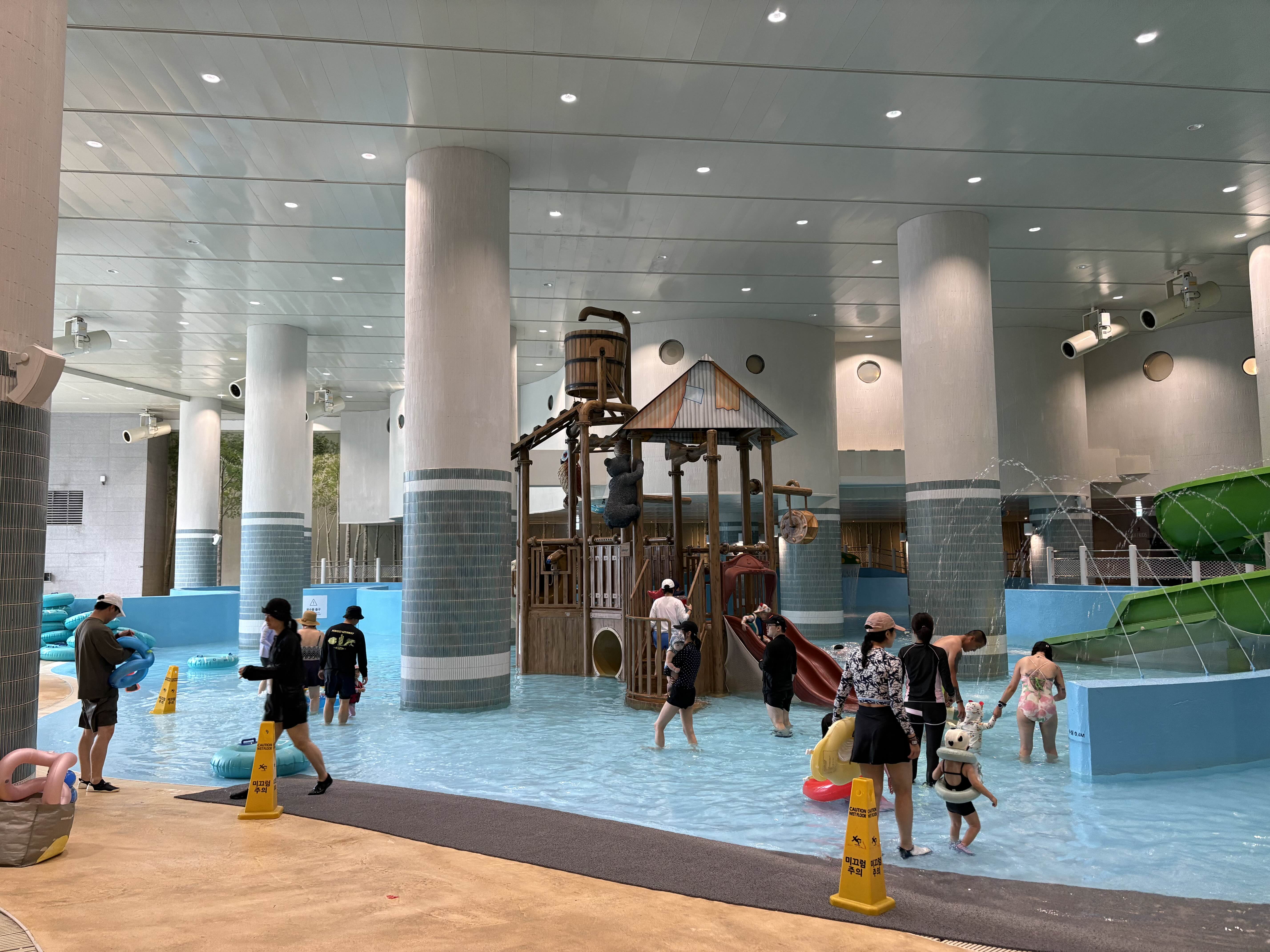 들어가자마자 보이는 아쿠아플레이존이에요. 유아들을 고려해서 만든 낮은 수심의 수영장인데, 미끄럼틀도 작은 것 두개 큰 것 하나가 있어서 미취학 아동까지는 놀 수 있을 것 같아요. 더 큰 아이라면 시시해 할 수도 있겠네요. 저희는 발만 조금 담그고, 락스 냄새가 심해서 밖으로 나갔는데, 웬걸 사람들이 모두 밖에 있네요!