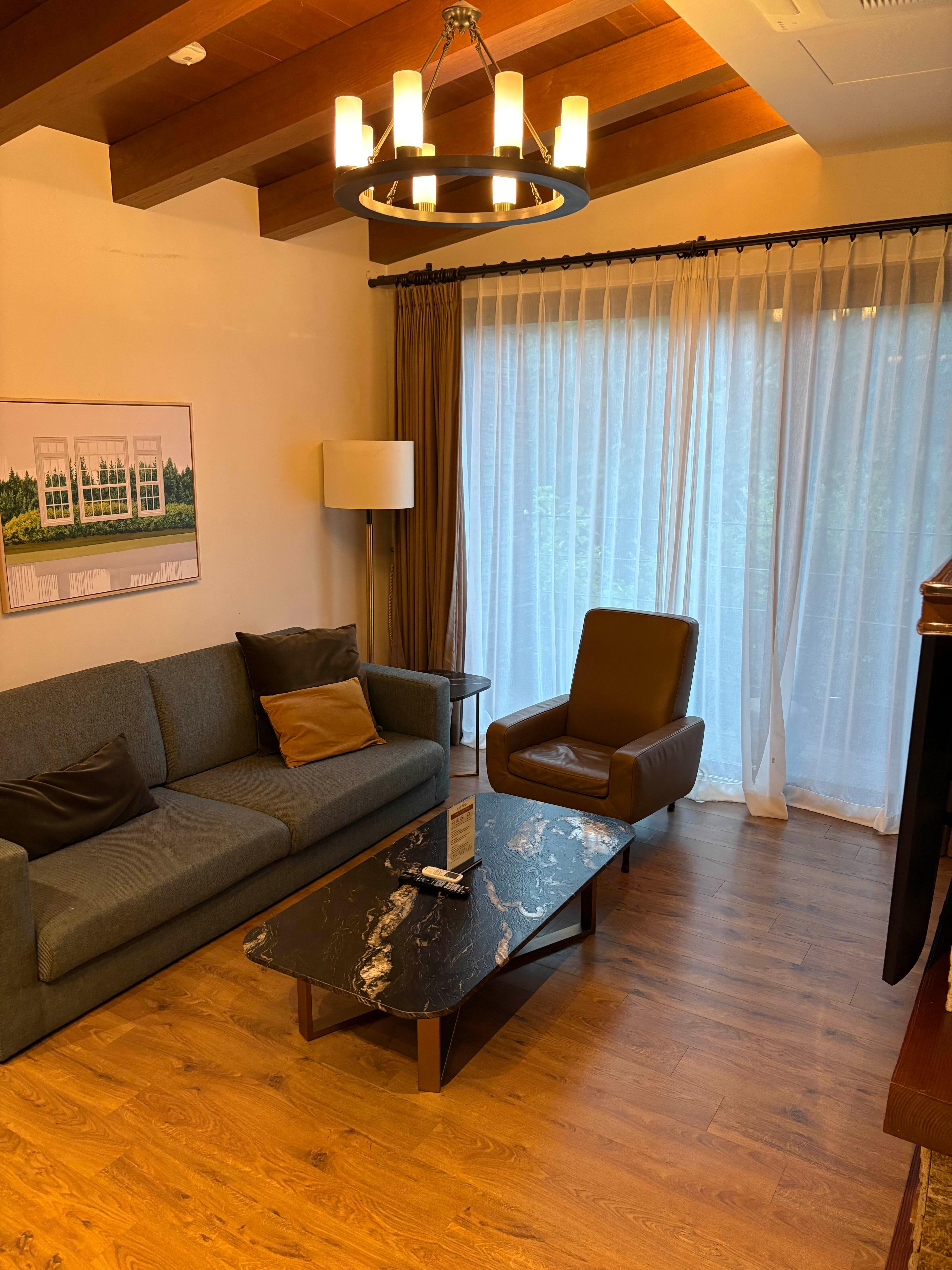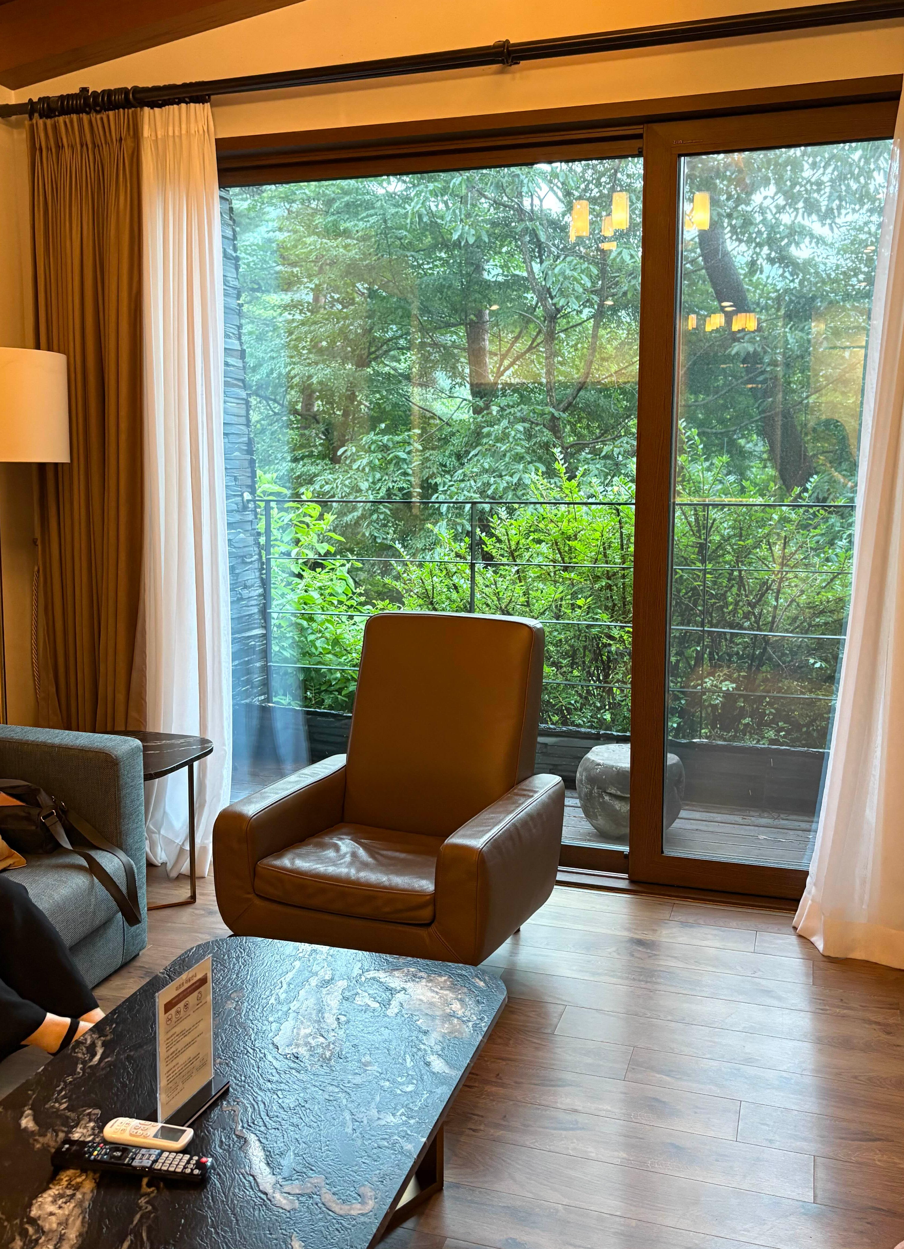 일단 커다란 거실과 주방이 있어요. 커튼을 차라락 열면 뒤에 너무나 푸릇푸릇한 나무들이 눈을 맑게 해줍니다.