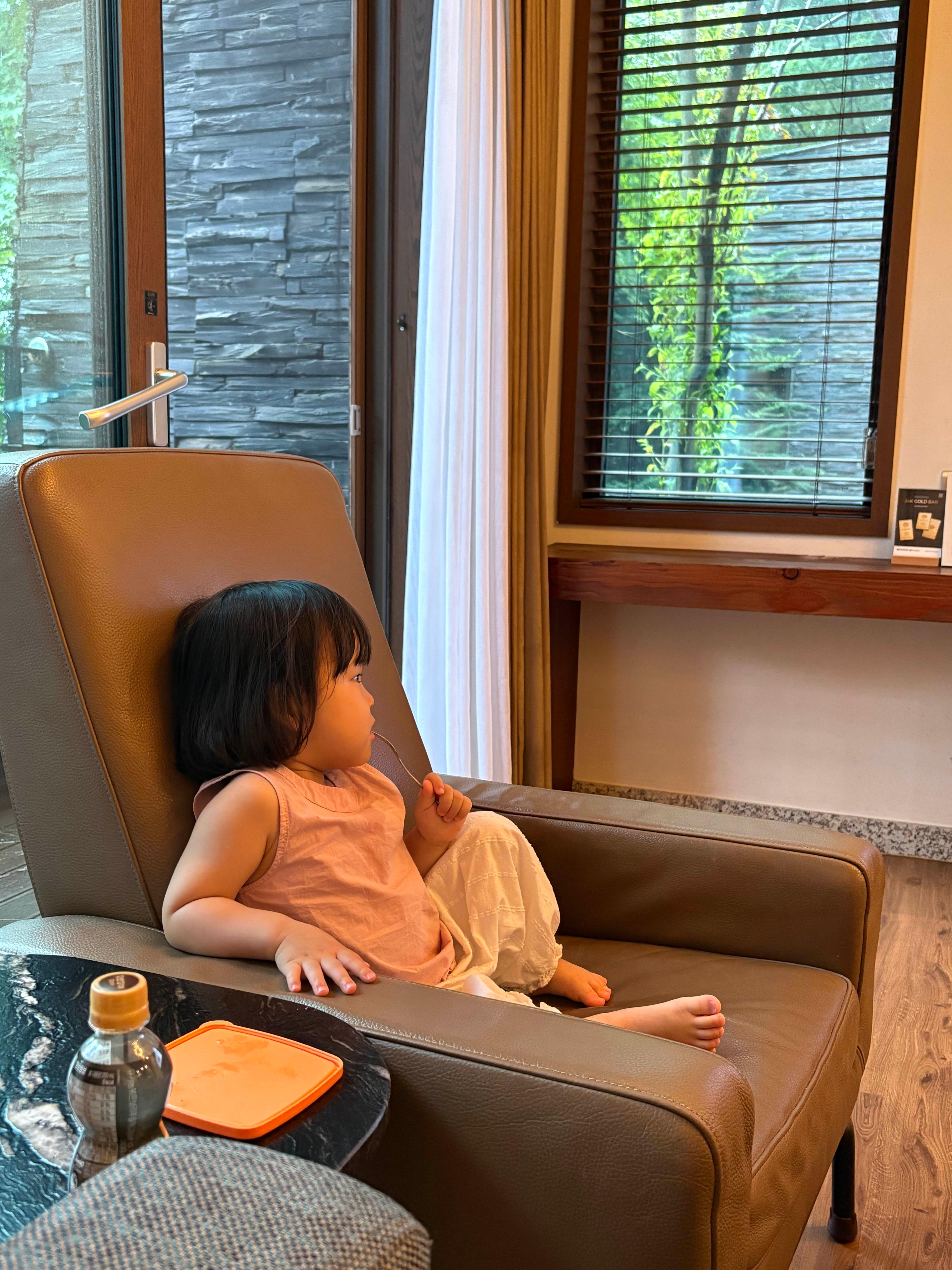 거실의 쇼파에서 쉬고있는 우리 딸! 메인창 옆의 작은 창을 통해서도 푸릇푸릇한 자연이 눈에 들어옵니다.