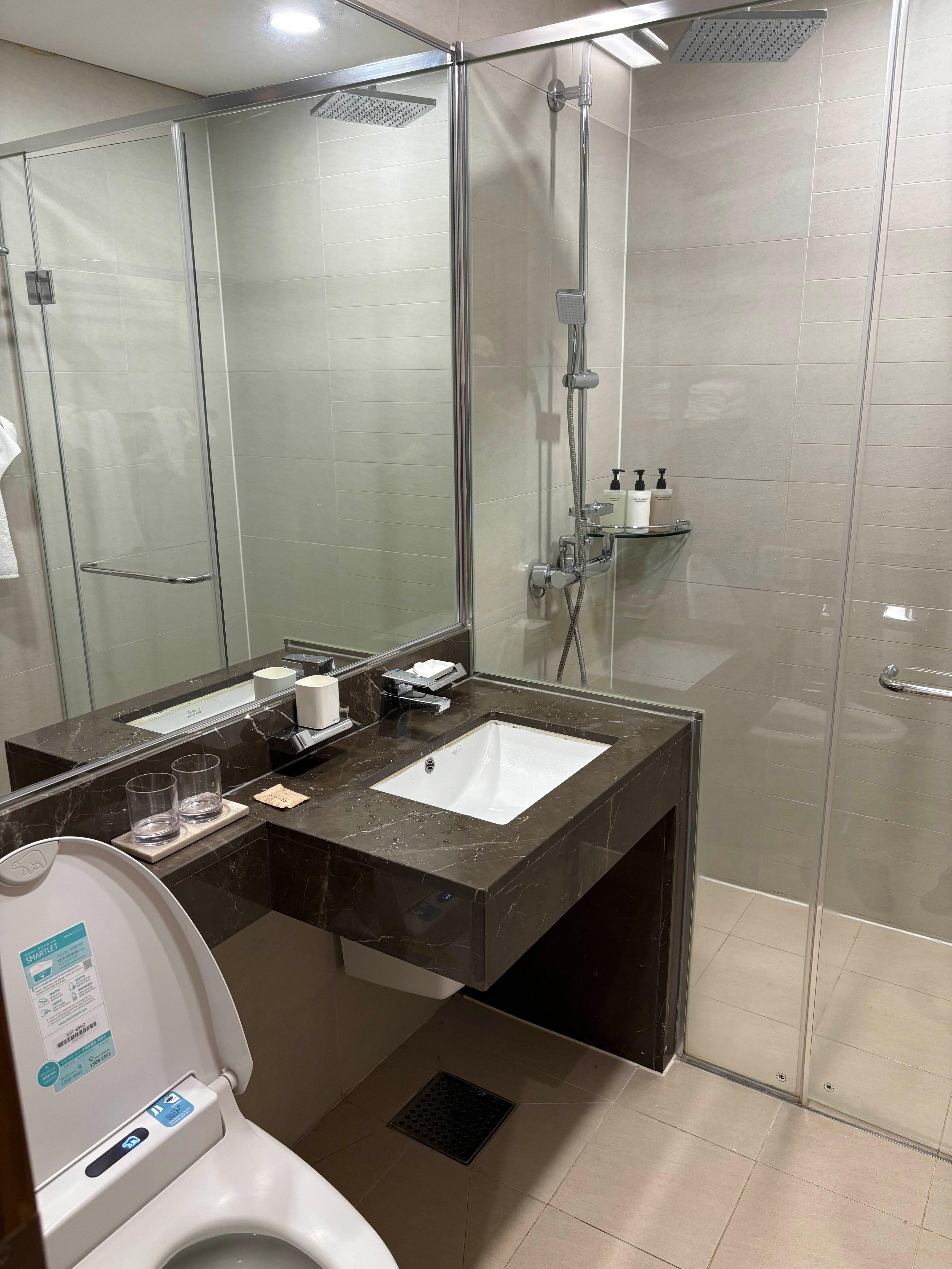 화장실은 샤워부스가 있는 아담한 사이즈입니다. 제가 묵은 S30이 객실정원이 5인까지 인데, 5명이서 묵기에는 화장실 이용이 조금 불편할 것 같다는 생각을 했어요. 두 가족이 온다면 화장실이 두 개 있는 객실(G40이상)이 맞을 것 같아요.