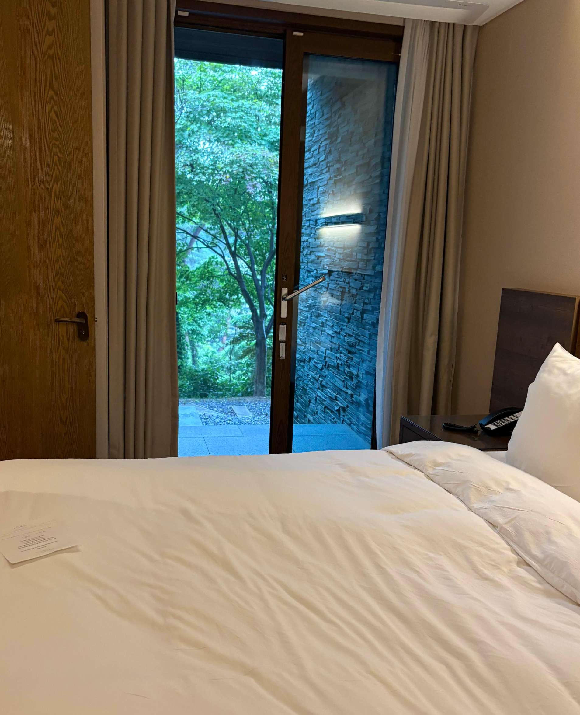 방 두개 중에서, 큰 방에는 침대가 하나 있고, 커튼을 열면 또 숲이에요! 누워서 숲을 보면 얼마나 힐링이되게요!
